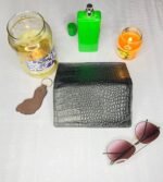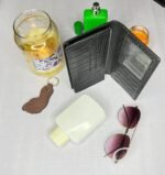 home, and office use. The wallet is lockable and made of leather/suede material.